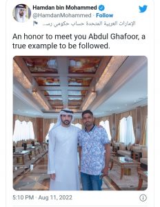 এর গফুরের সন্ধান পাওয়ার পর তাকে ফোনও দিয়েছিলেন শেখ হামদান। শিগগিরই তার সঙ্গে দেখা করার আশ্বাসও দিয়েছিলেন যুবরাজ।